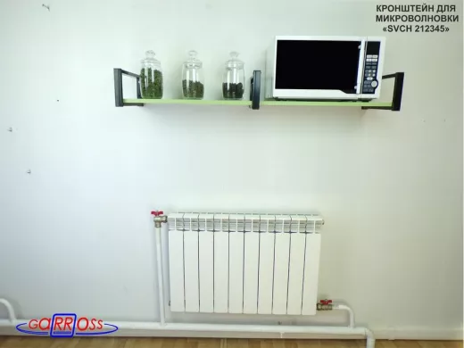 • Полка надежно крепится к стене при помощи анкеров или шурупов с дюбелями, на ней можно разместить микроволнрвую печь, кухонную технику, посуду, специи