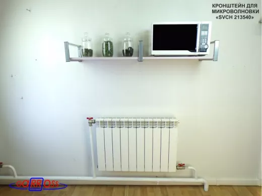 • Полка надежно крепится к стене при помощи анкеров или шурупов с дюбелями, на ней можно разместить микроволнрвую печь, кухонную технику, посуду, специи