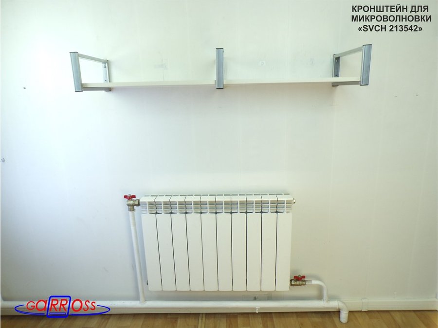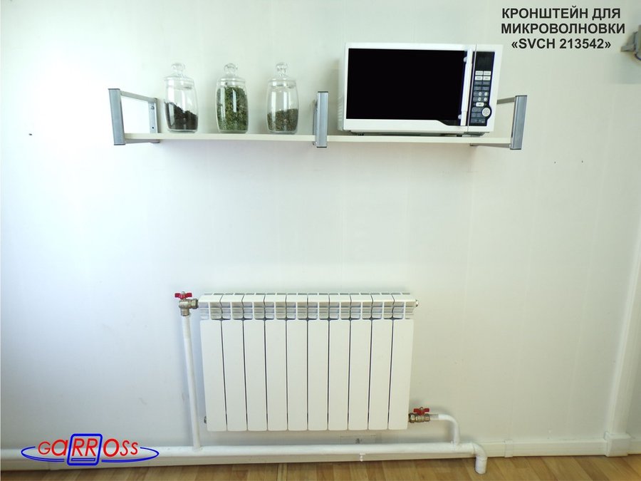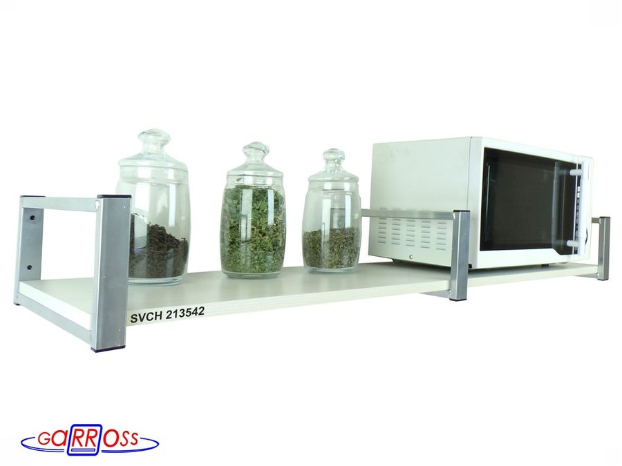 - Полка надежно крепится к стене при помощи анкеров или шурупов с дюбелями, на ней можно разместить микроволнрвую печь, кухонную технику, посуду, специи