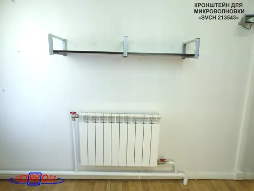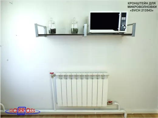 • Полка надежно крепится к стене при помощи анкеров или шурупов с дюбелями, на ней можно разместить микроволнрвую печь, кухонную технику, посуду, специи