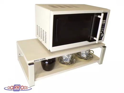 • Полка надежно крепится к стене при помощи анкеров или шурупов с дюбелями, на ней можно разместить микроволновую печь, кухонную технику, посуду, специи