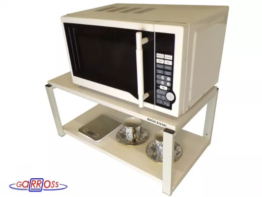 - Полка надежно крепится к стене при помощи анкеров или шурупов с дюбелями, на ней можно разместить микроволнрвую печь, кухонную технику, посуду, специи