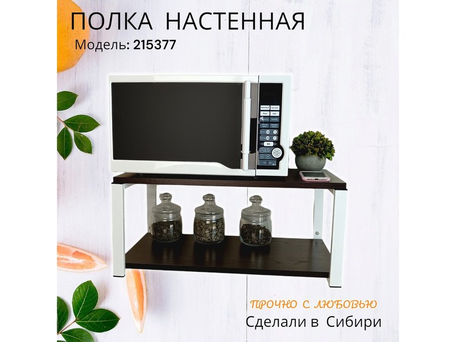 • Полка надежно крепится к стене при помощи анкеров или шурупов с дюбелями, на ней можно разместить микроволновую печь, кухонную технику, посуду, специи