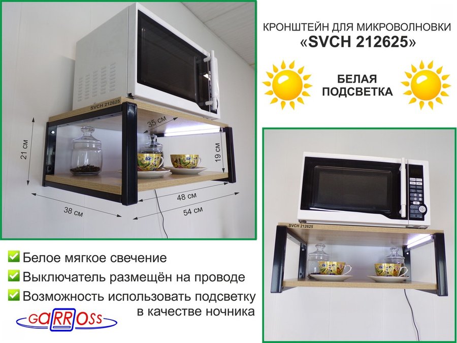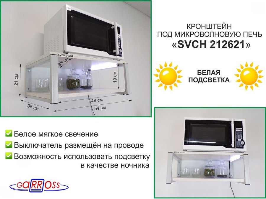 В корзину Купить в 1 клик Кронштейн для микроволновки с подсветкой, 21см серый "SVCH 212621" две полки 35х54см, сосна выбел.