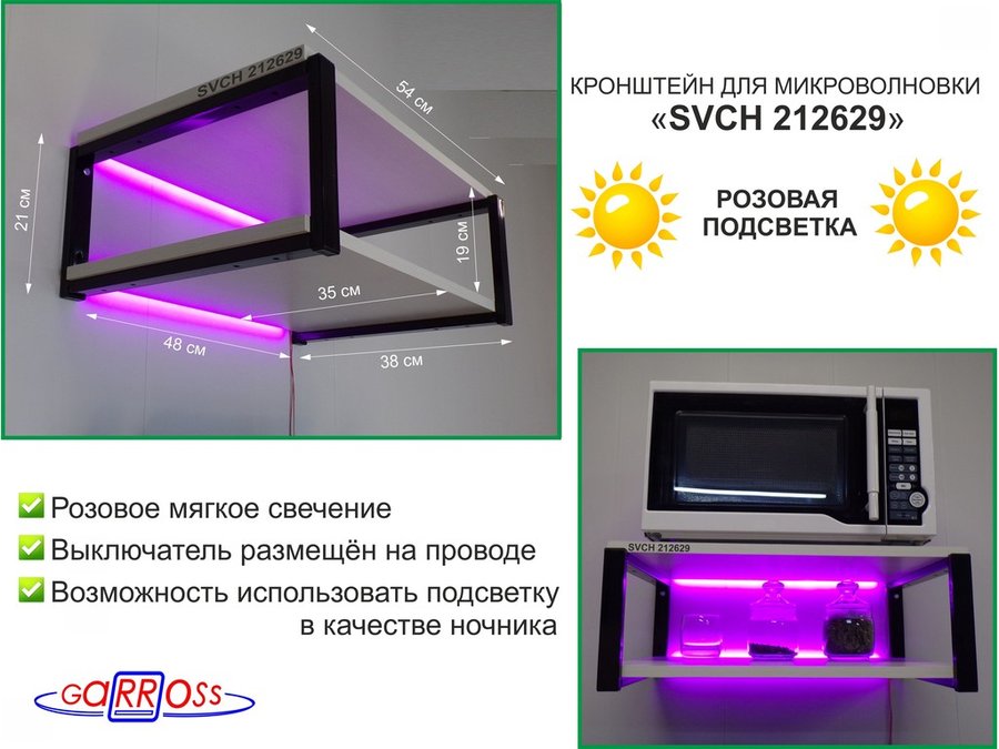 В корзину Купить в 1 клик Кронштейн для микроволновки с розовой подсветкой, 21см черный "SVCH 212629" две полки 35х54см, сосна