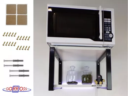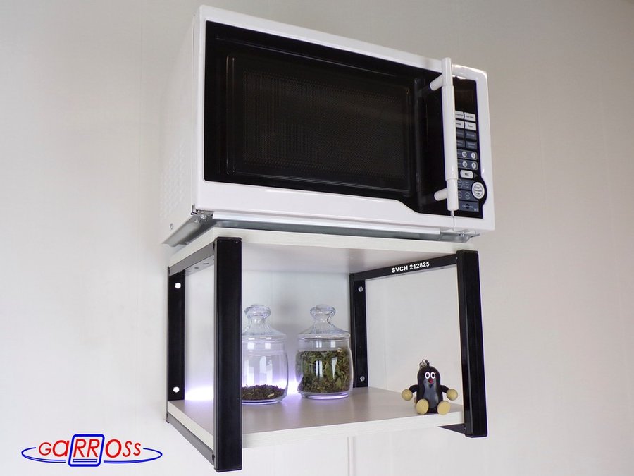 • Полка надежно крепится к стене при помощи анкеров или шурупов с дюбелями, на ней можно разместить микроволновую печь, кухонную технику, посуду, специи