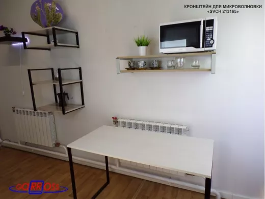 - Полка надежно крепится к стене при помощи анкеров или шурупов с дюбелями, на ней можно разместить микроволнрвую печь, кухонную технику, посуду, специи