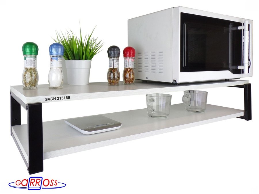 - Полка надежно крепится к стене при помощи анкеров или шурупов с дюбелями, на ней можно разместить микроволнрвую печь, кухонную технику, посуду, специи