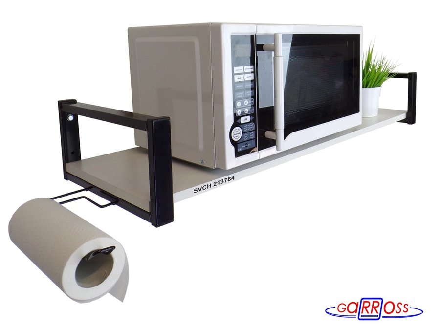 • Надежно крепится к стене при помощи шурупов с дюбелями, на ней можно разместить микроволновую печь, кофемашину, кухонную технику, посуду, специи