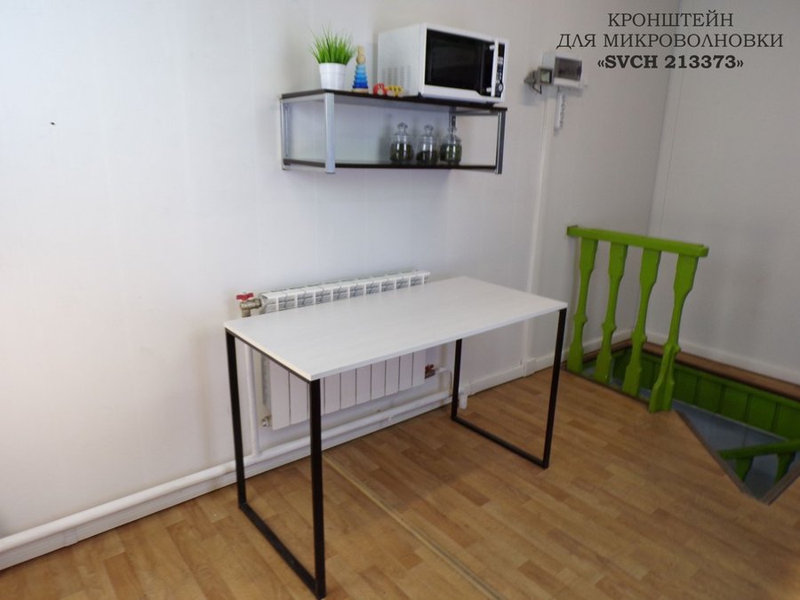 Полка надежно крепится к стене при помощи анкеров или шурупов с дюбелями, на ней можно разместить микроволновую печь, кухонную технику, посуду, специи