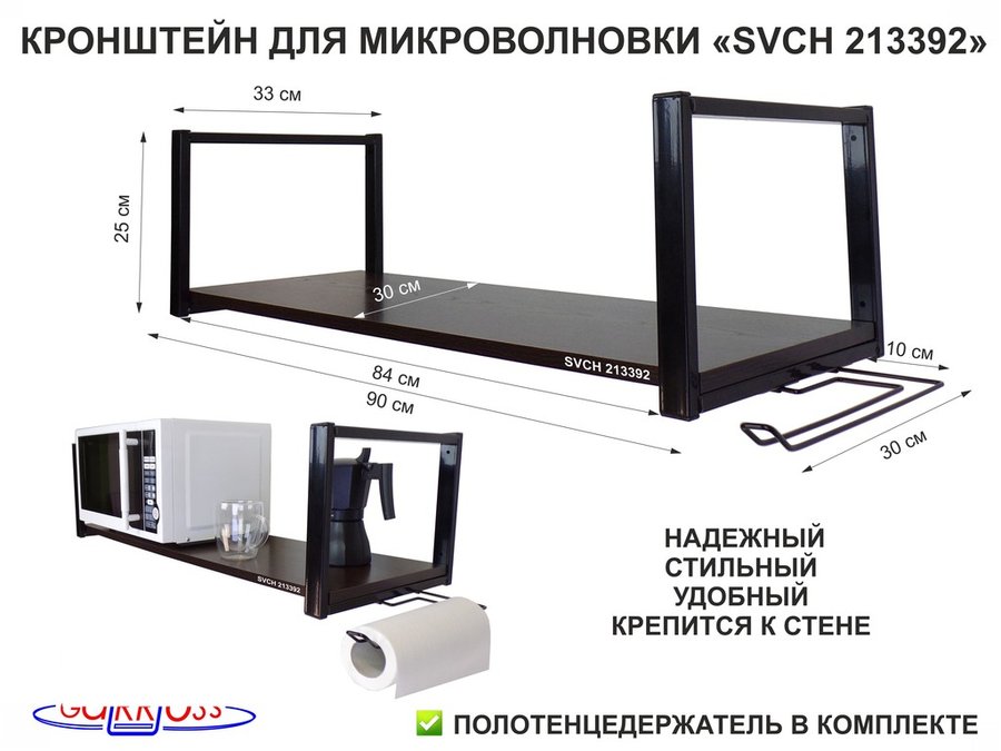 Кронштейн для СВЧ, 25см черный, полка 90х30см, держатель полотенец правая сторона"SVCH 213392" венге