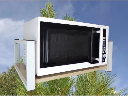 • Полка надежно крепится к стене при помощи анкеров или шурупов с дюбелями, на ней можно разместить микроволновую печь, кухонную технику, посуду, специи