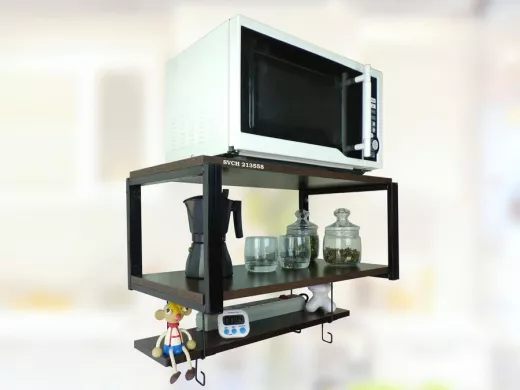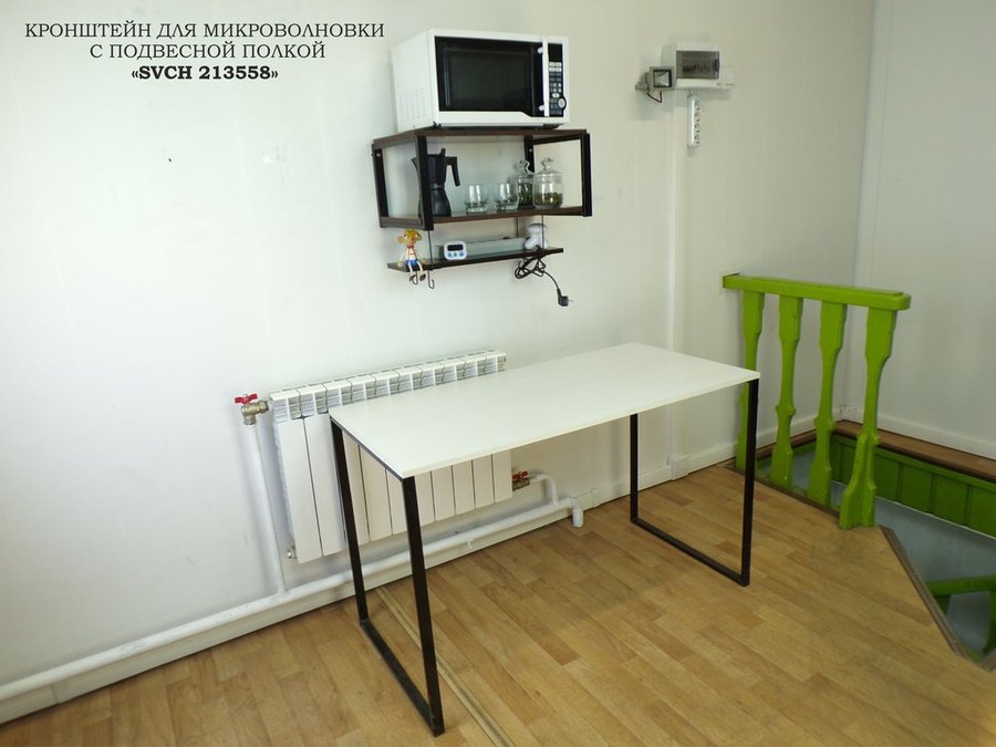 - Полка надежно крепится к стене при помощи анкеров или шурупов с дюбелями, на нее можно разместить микроволновую печь, кофемашину, тостер и другую кухонную технику, посуду, специи, различные необходимые мелочи