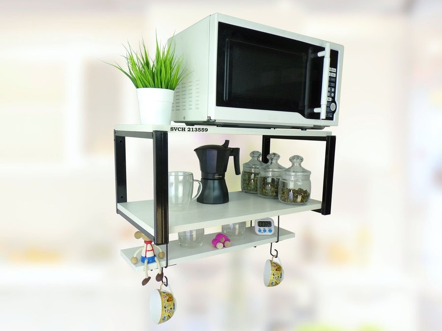 • На верхней полке можно разместить микроволновую печь или другую кухонную технику, на средней отлично "встанет" посуда, баночки под сыпучее и многое другое, а нижняя полка отлично подойдет для специй, таймера или маленьких сувениров