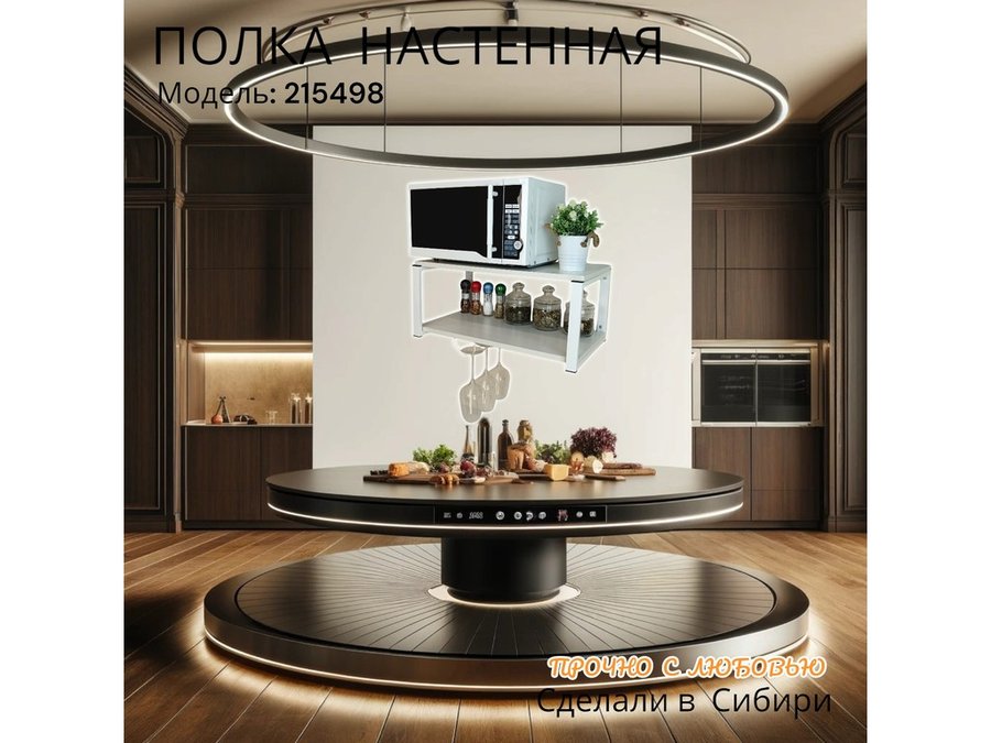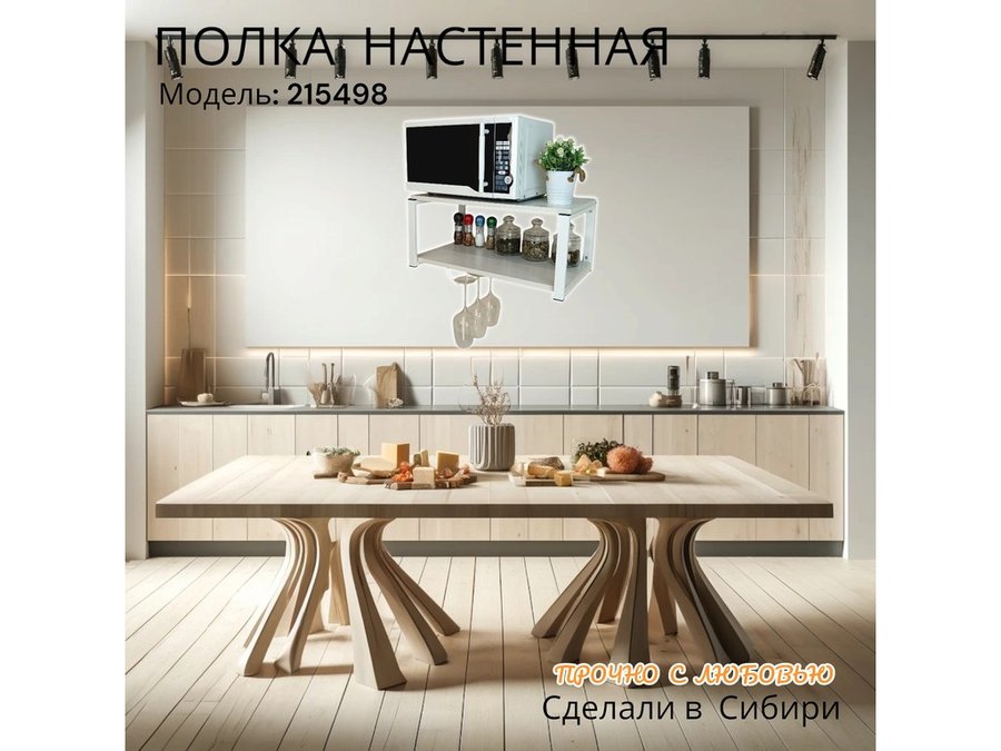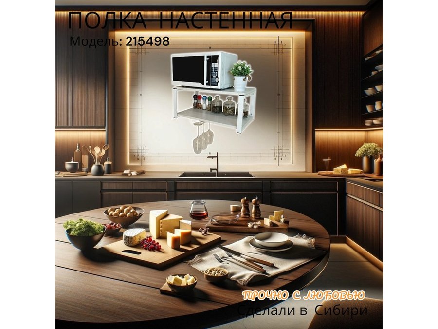 • Полка надежно крепится к стене при помощи анкеров или шурупов с дюбелями, на ней можно разместить микроволновую печь, кухонную технику, посуду, специи
