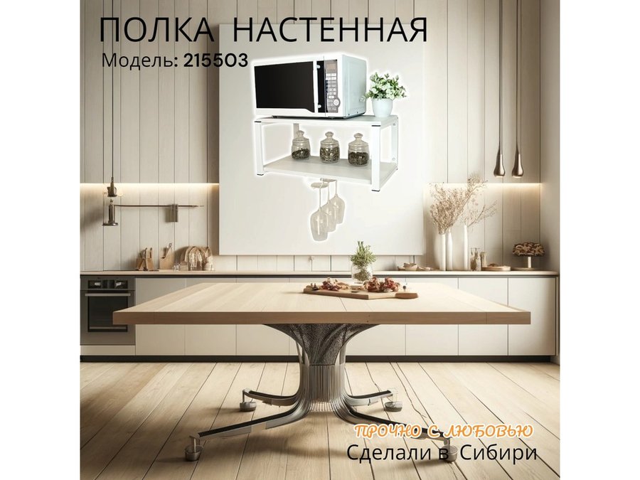 - Полка надежно крепится к стене при помощи анкеров или шурупов с дюбелями, на ней можно разместить микроволновую печь, кухонную технику, посуду, специи