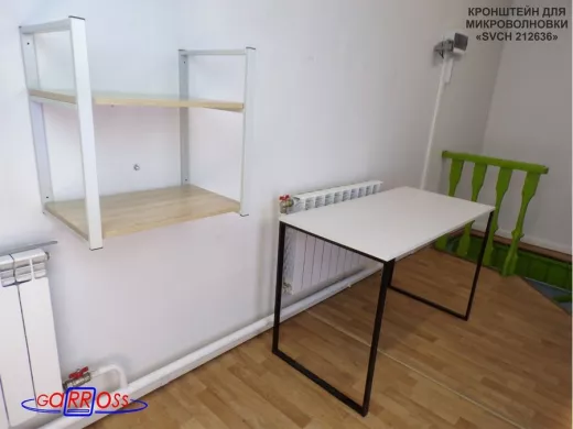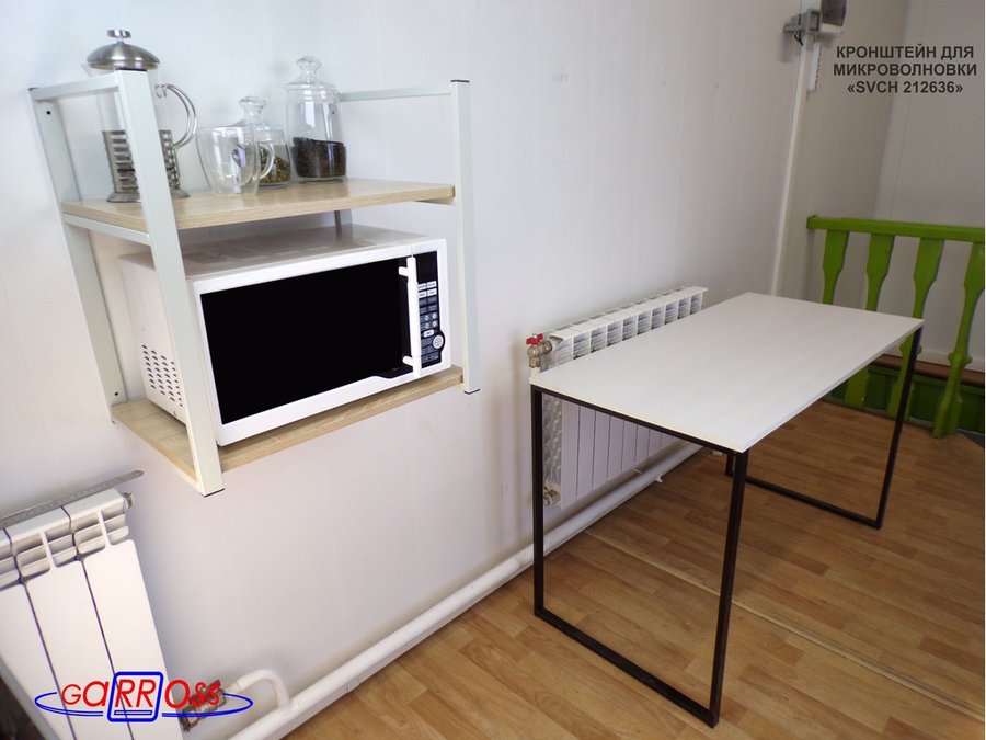 • Полка надежно крепится к стене при помощи анкеров или шурупов с дюбелями, на ней можно разместить микроволновую печь, кухонную технику, посуду, специи