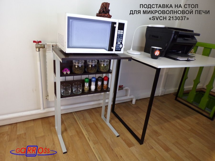 Столик для микровоновой печи позволяет эффективно использовать место на кухне. Важно отметить, что столик занимает немного пространства, поэтому ему найдётся место даже в самой малогабаритной квартире или офисе. Столик, в стиле Лофт, может быть использован в качестве подставки для цветов и книг, места для работы, места для хранения мелочей, в спальню для завтра, как обеденный стол для перекуса, для офиса и отдыха на даче. Для кабинета/спальни/гостиной. Стол универсален и будет отлично смотреться и в интерьере уютного дома, и в интерьере делового офиса, и в салоне красоты. Столик, без труда, можно перенести в любое место.