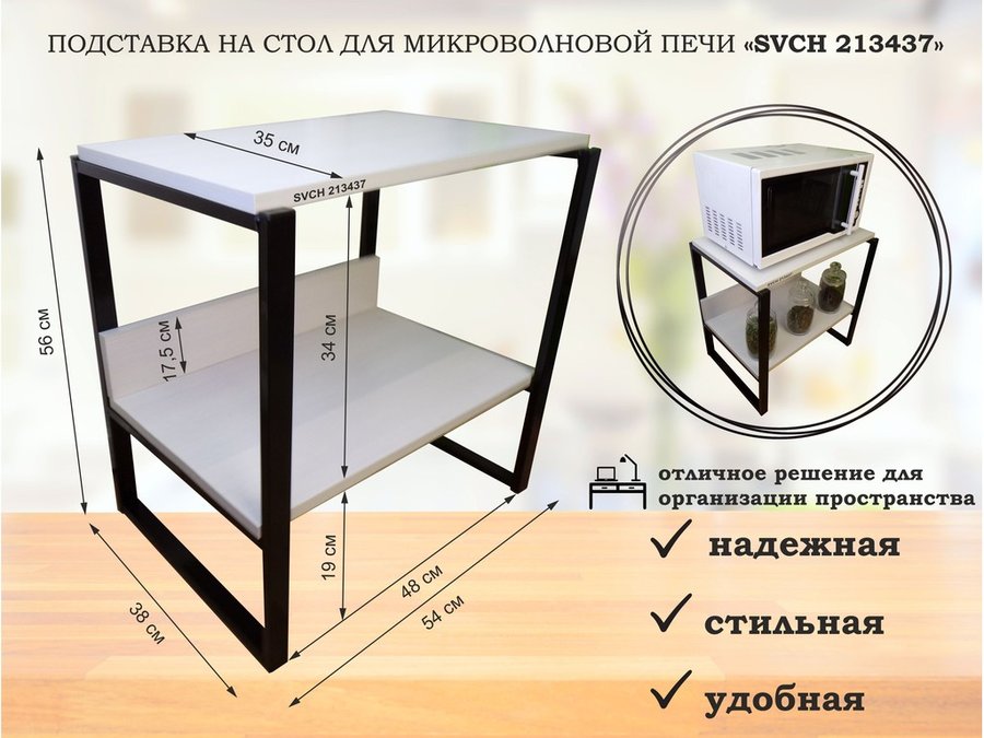 Подставка, полка на стол для микроволновой печи, высота 56см черный "SVCH 213437" полка 35х54, сосна