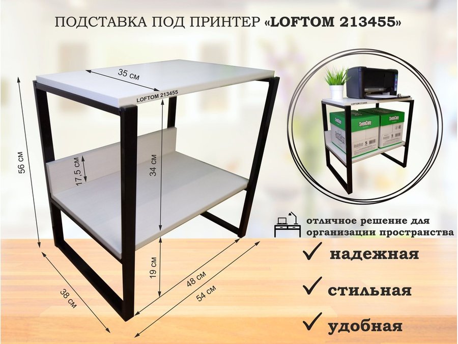 Подставка под принтер, столик для МФУ, полка для документов, 56см черный "LOFTOM 213455" 35х54,сосна