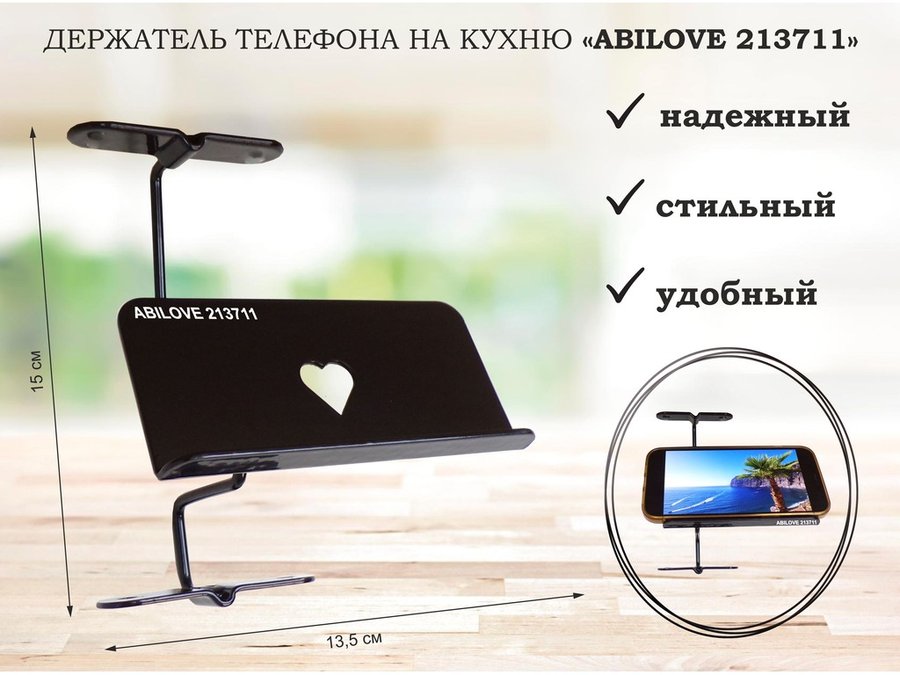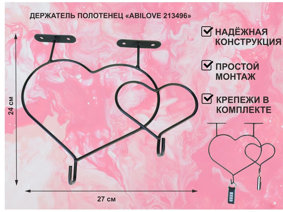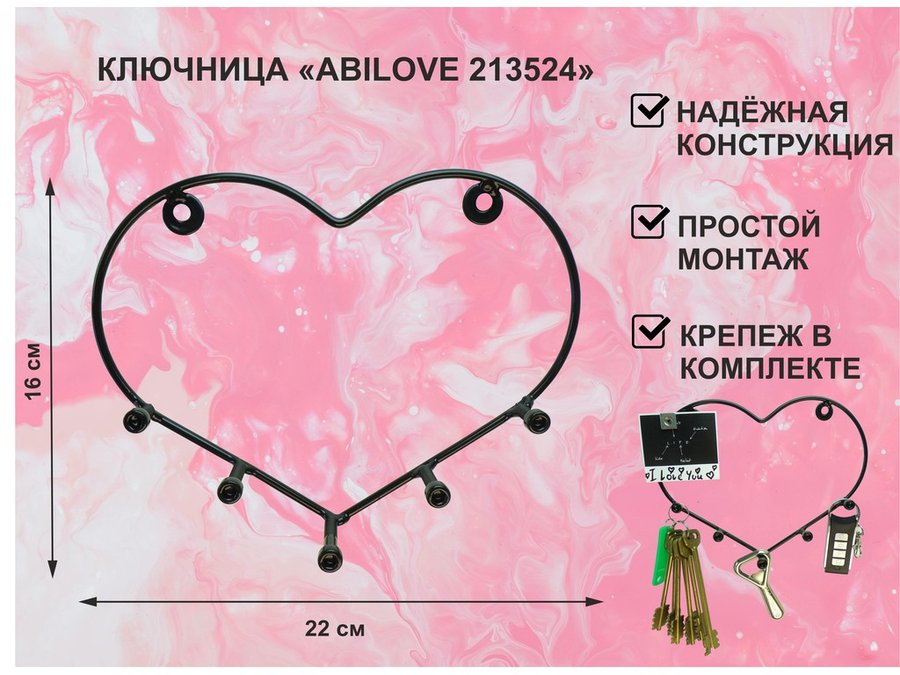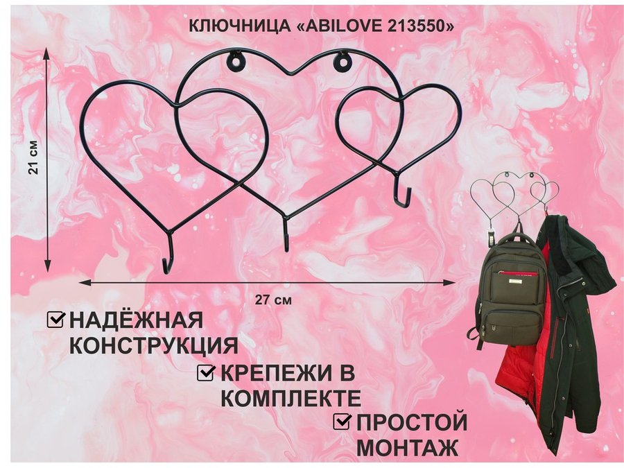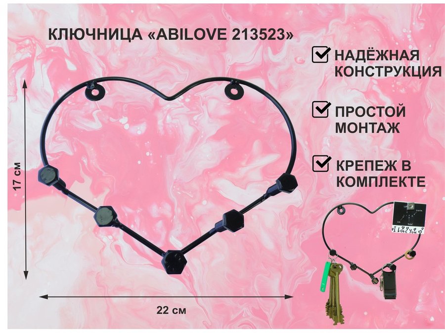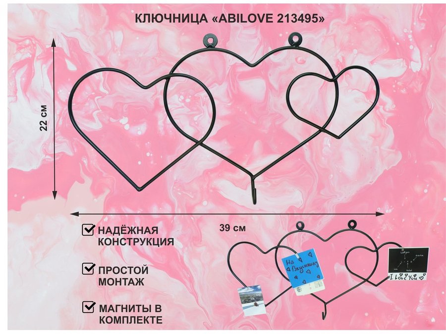 Ключница с крючком и 3 магнитами для записок и фотографий, 3 сердца,вешалка, чёрный "ABILOVE 213495"