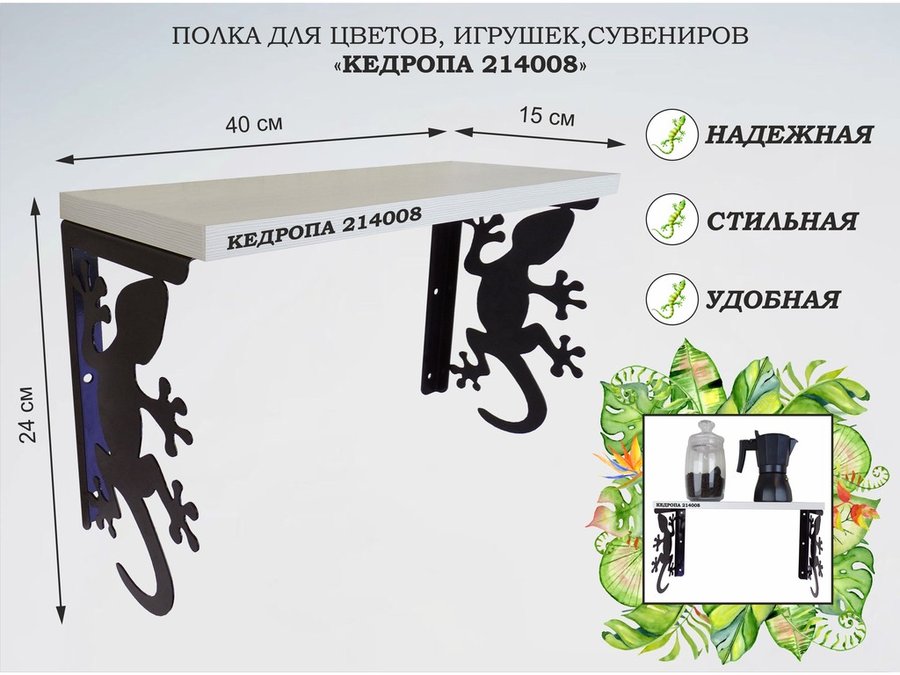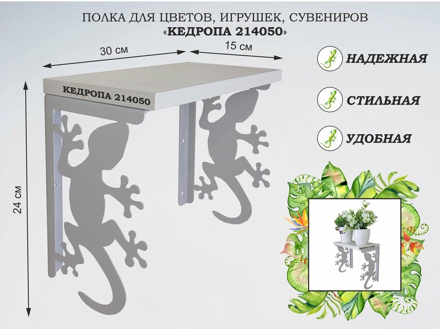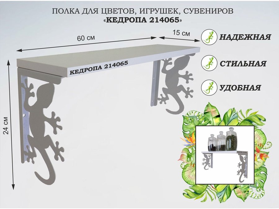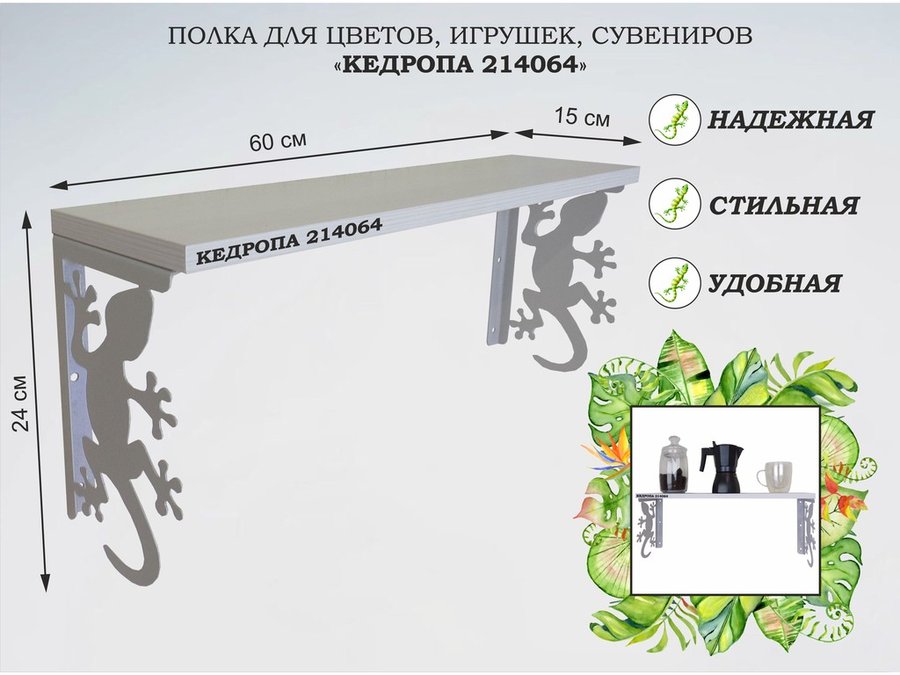 Полка для наград, кубков, медалей, грамот "КЕДРОПА-214045 гекон" размер 15х60х24 см, сосна с сердцем