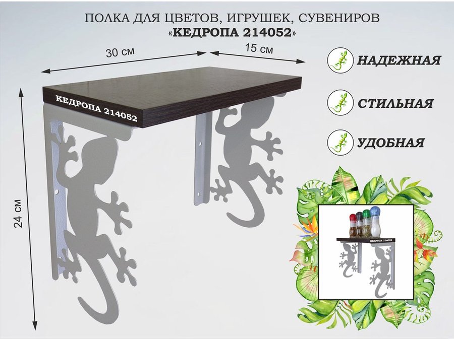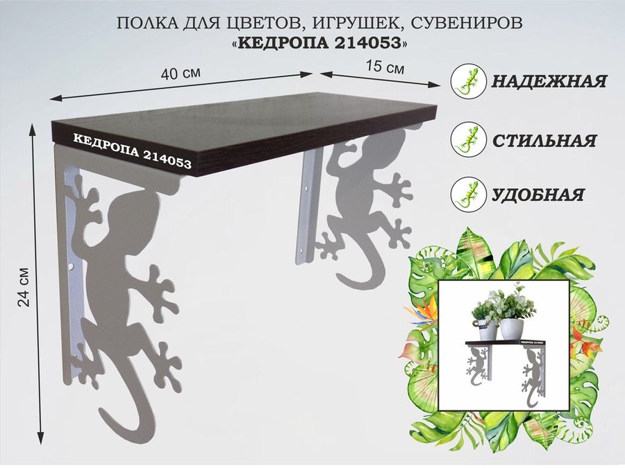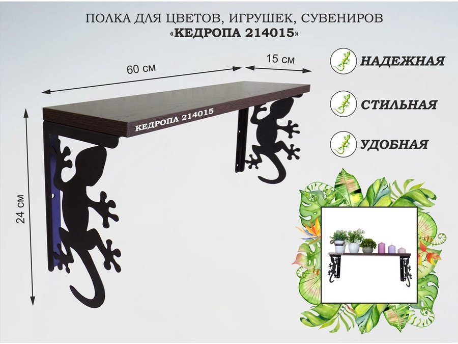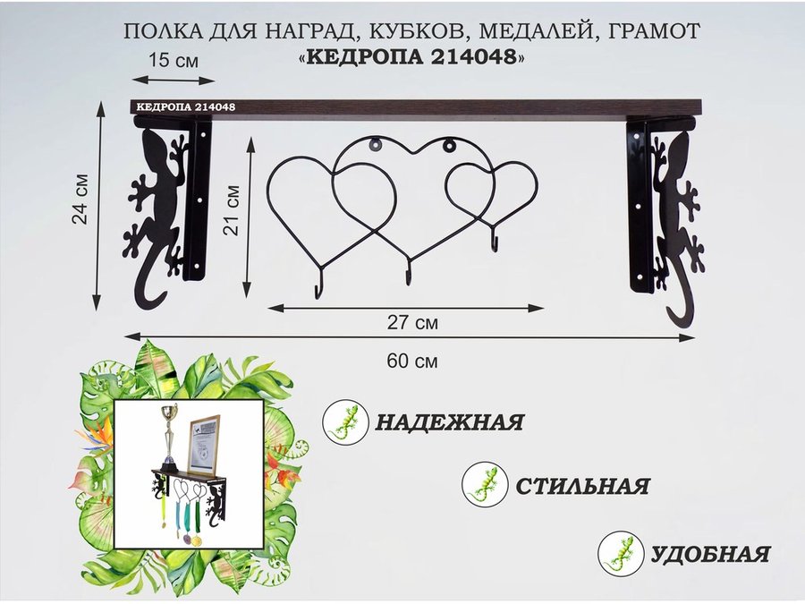 Полка для наград, кубков, медалей, грамот "КЕДРОПА-214043 гекон" размер 15х60х24 см, венге с сердцем