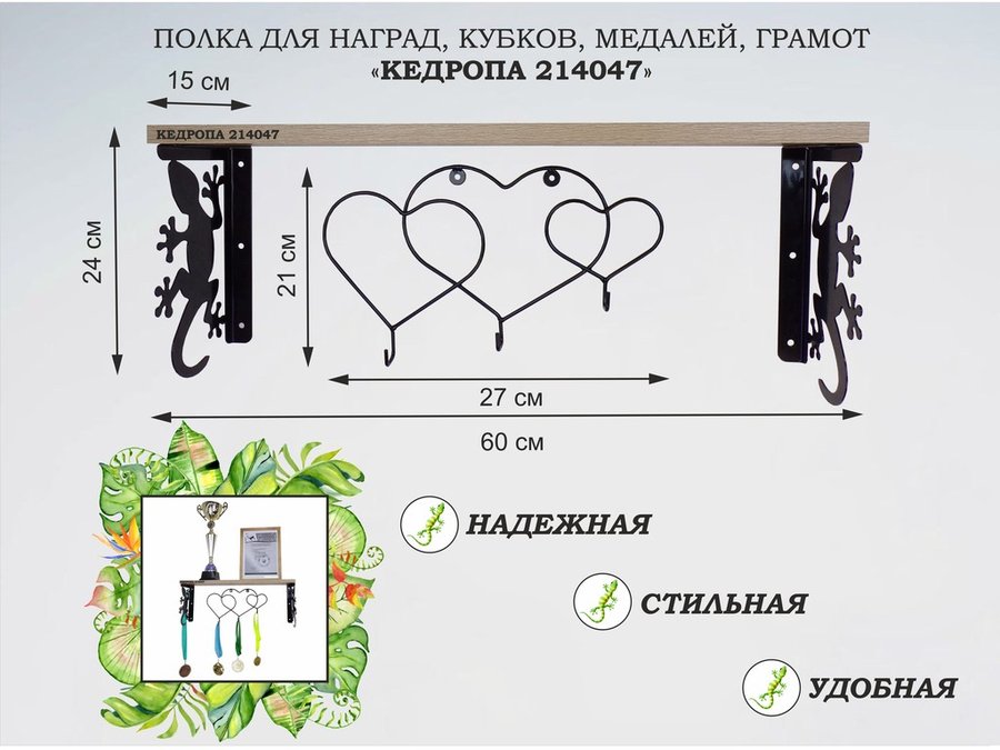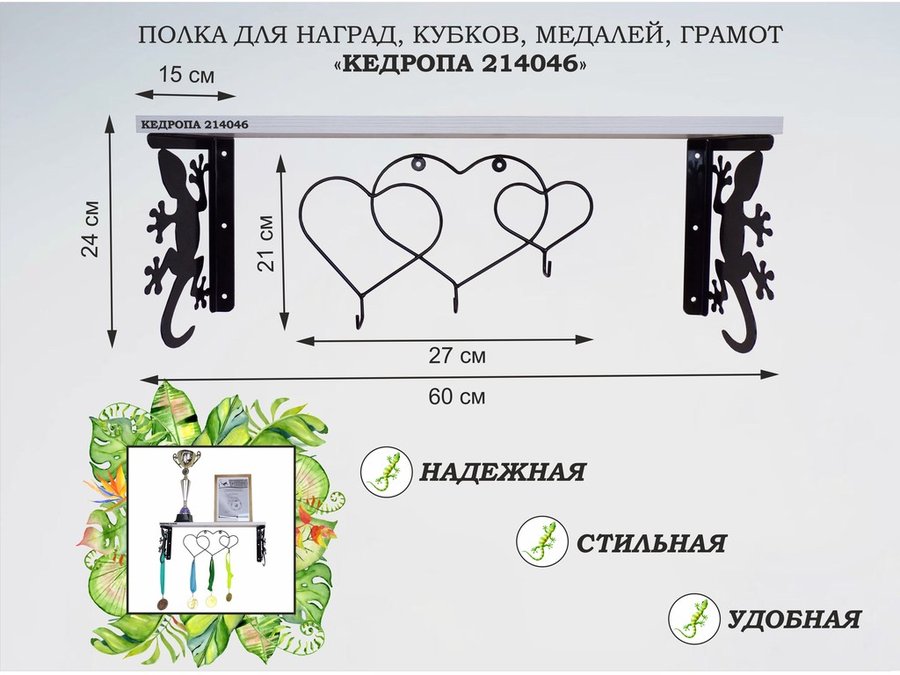 Полка для наград, кубков, медалей, грамот "КЕДРОПА-214046 гекон"размер 15х60х24 см, сосна с сердцами